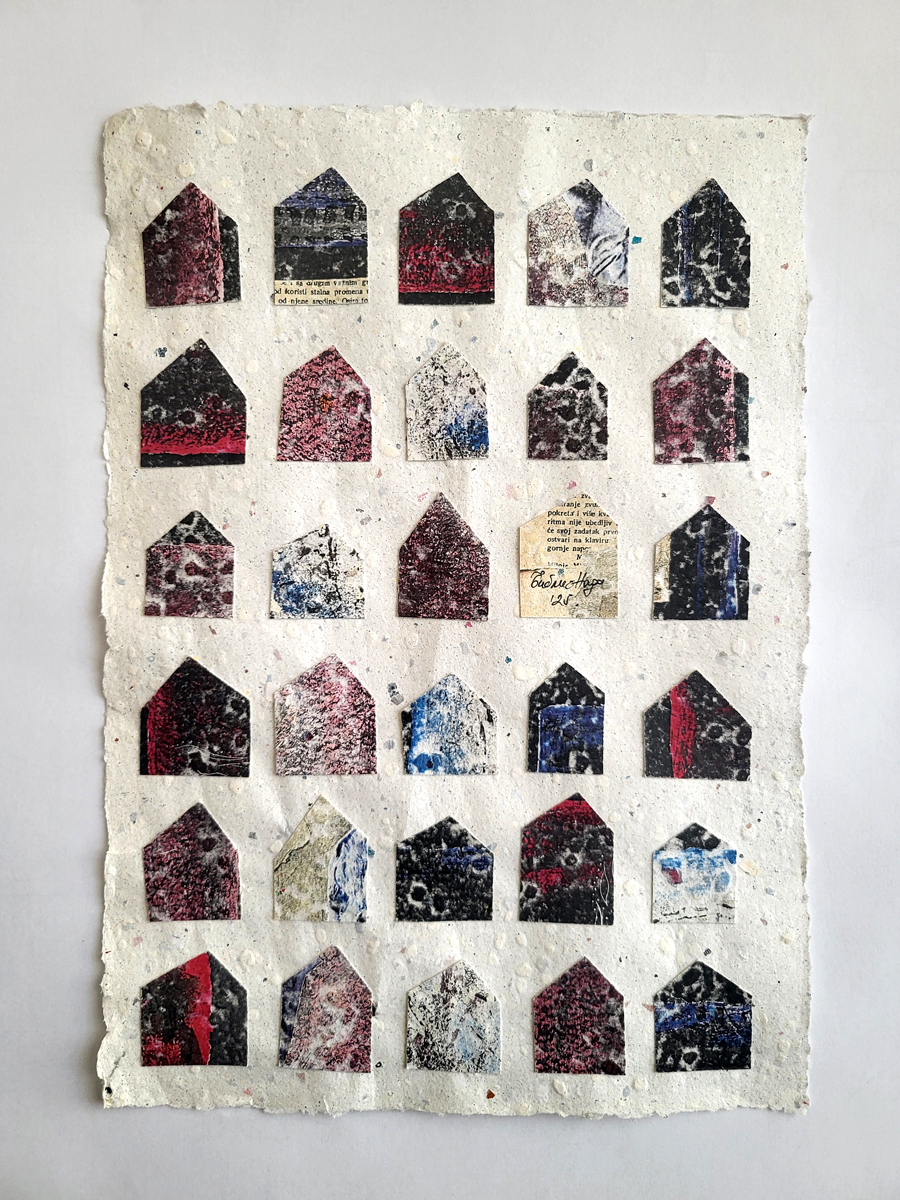 | Opis / Napomena | Radovi predstavljaju seriju formi u obliku kuće raspoređenih u ritmičkoj mreži ručno rađenom papiru koji prave mladi sa smetnjama u razvoju. |